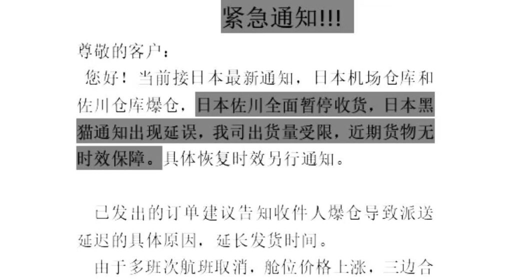航空便の本数が減ったことで、日本向け配送が前より大幅に不安定になっている状況です。